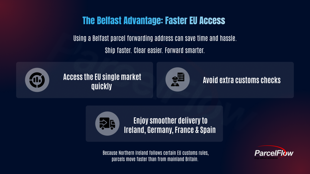 Because Northern Ireland continues to follow certain EU customs rules under the Northern Ireland Protocol, parcels moving from Belfast to EU countries often clear faster and with less red tape than those from mainland Britain.
