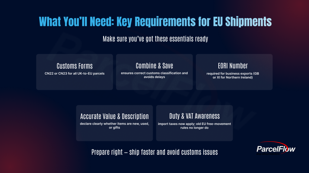 Customs documentation. Any parcel (not just large freight) shipped from the UK to the EU needs a customs declaration form. For postal services, forms like CN22 or CN23 may apply.