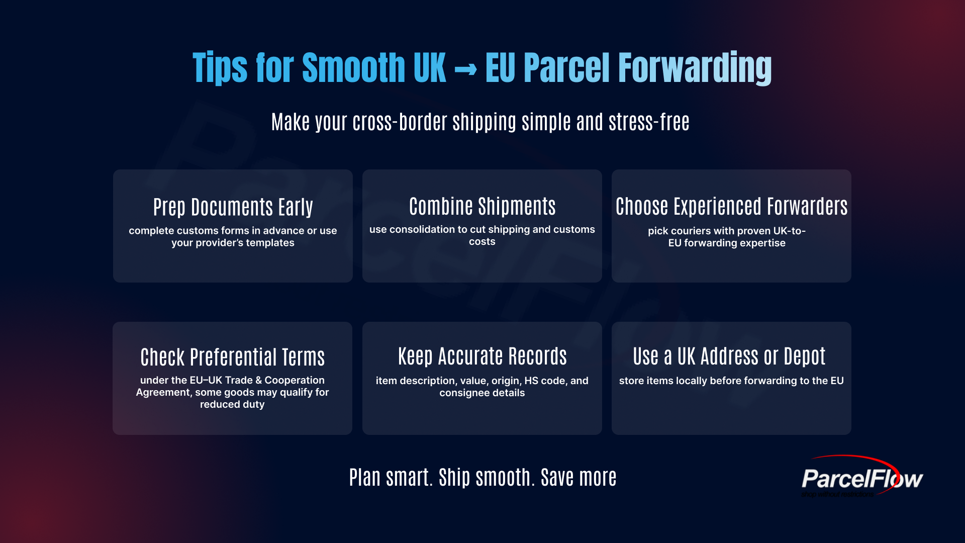 - Choose forwarders or couriers with UK parcel forwarding and forwarding from UK to EU experience.
