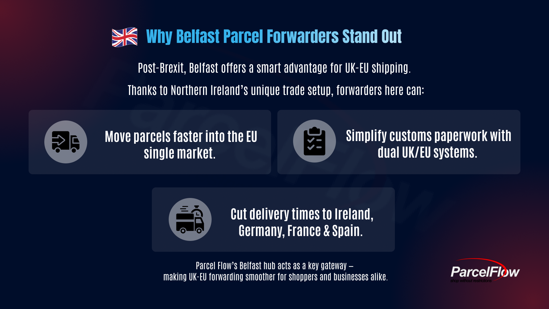 Parcel Flow’s Belfast hub, for instance, serves as a strategic gateway for smooth UK-EU forwarding, offering both personal and business clients a simpler route through Brexit bureaucracy.